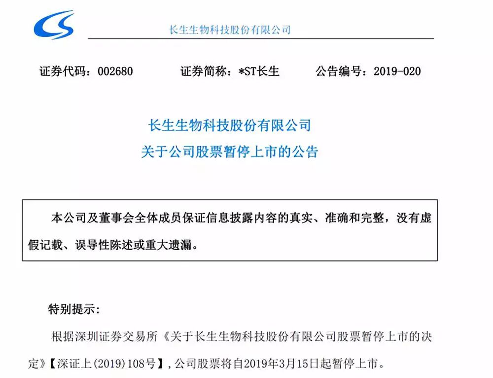 3月13日,长生生物科技股份有限公司发布公告称,于2019年3月13日收到深圳证券交易所下达的《关于长生生物科技股份有限公司股票暂停上市的决定》【深证上(2019)108号】,公司股票将自2019年3月15日起暂停上市。
