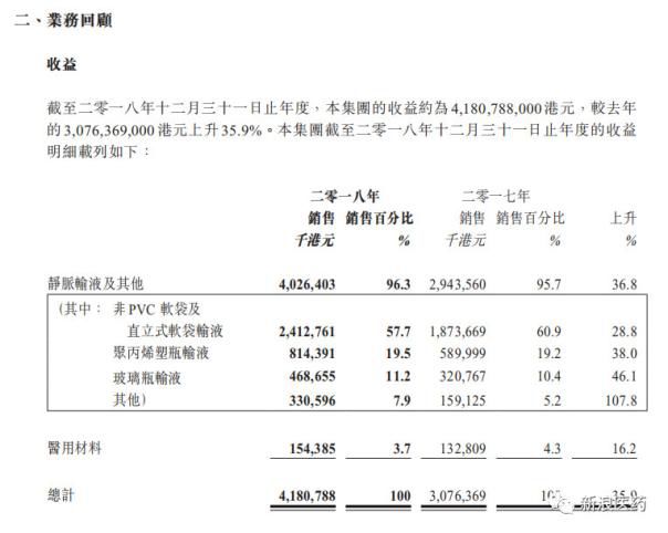 2018年,静脉输液业务实现销售收入41.8亿港元,相较2017年年度增长35.9%,但是相对于2017年增速达45%的速度已经有所回落。对于静脉输液业务收入的增加,石四药给出的原因是由于静脉输液之销量及平均售价上升。
